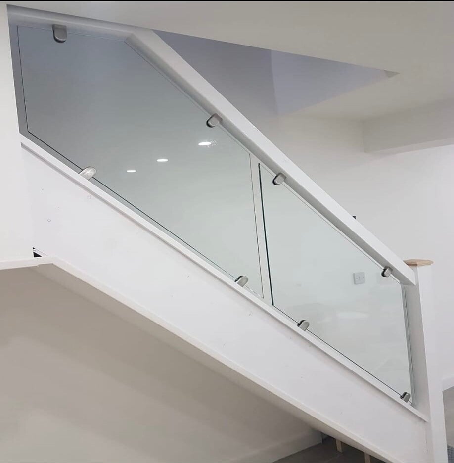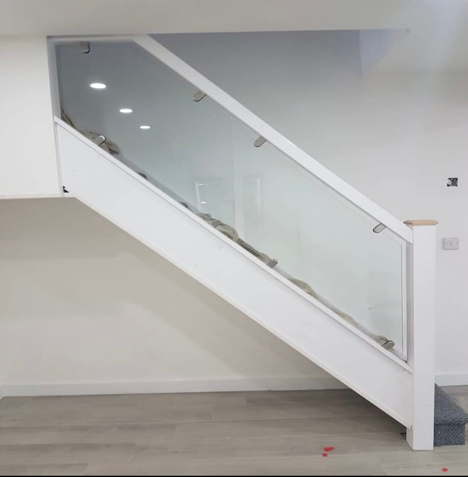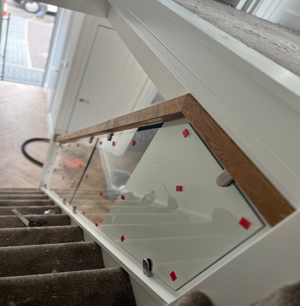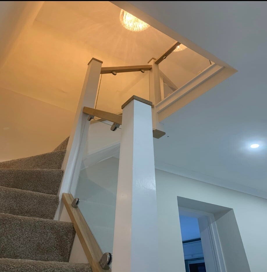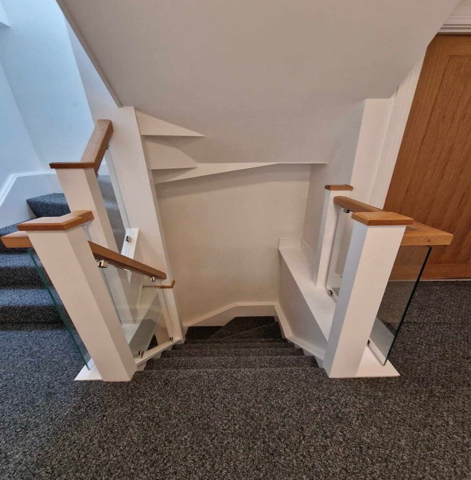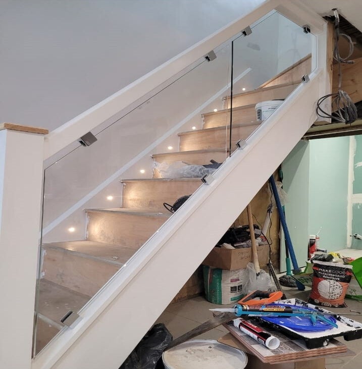 Stair refurb over clad with seamless mitre joint, base rail and Glass