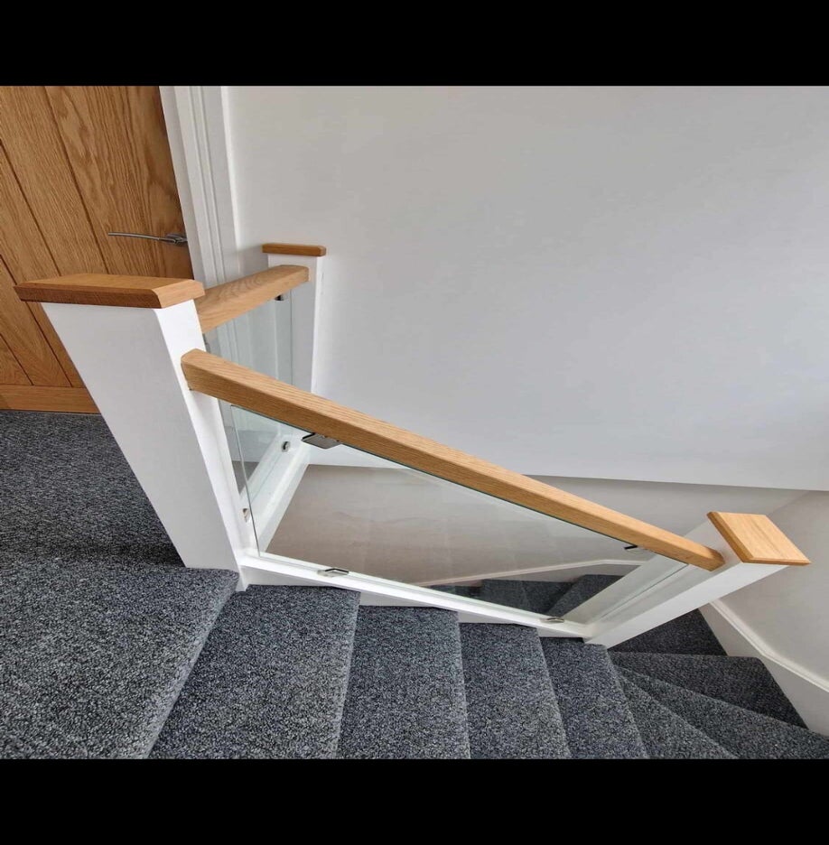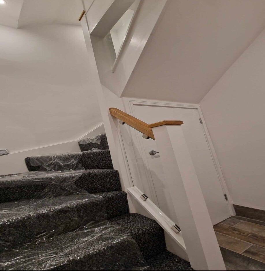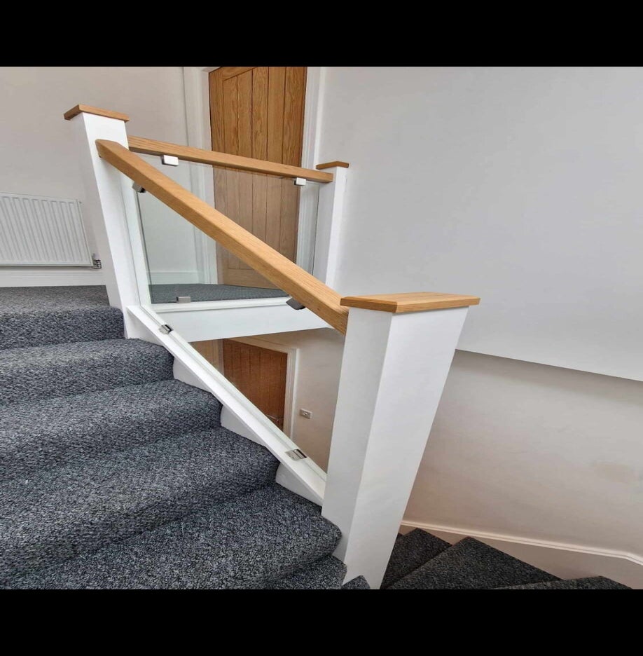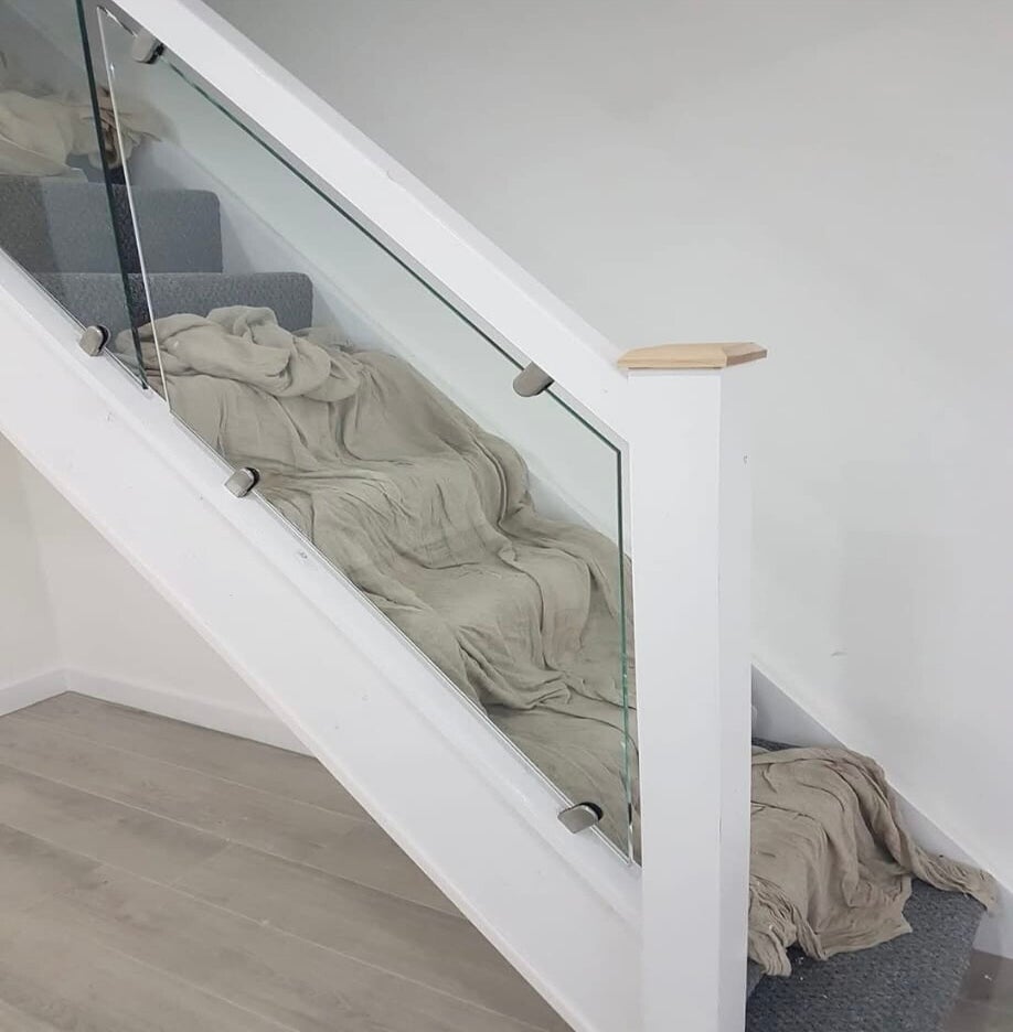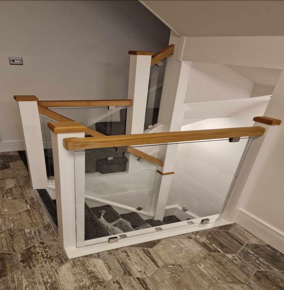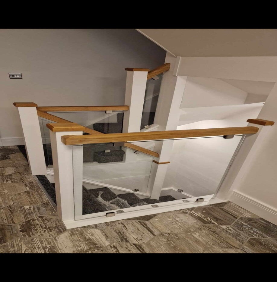 Stair refurb over clad with seamless mitre joint, base rail and Glass